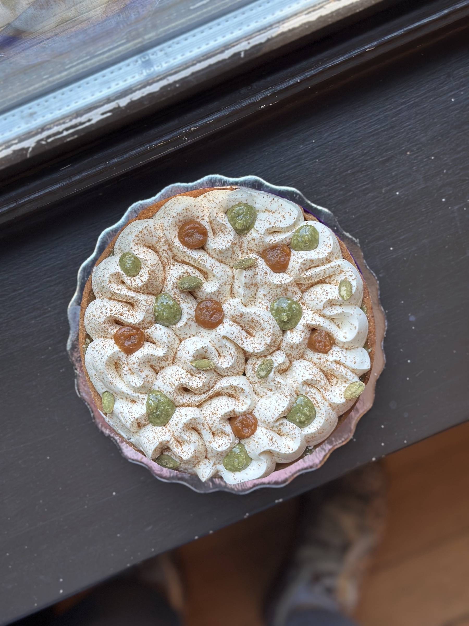 shortbread crust, pumpkin pie filling, pumpkin praliné, vanilla white chantilly with pumpkin spice & pumpkin compote.